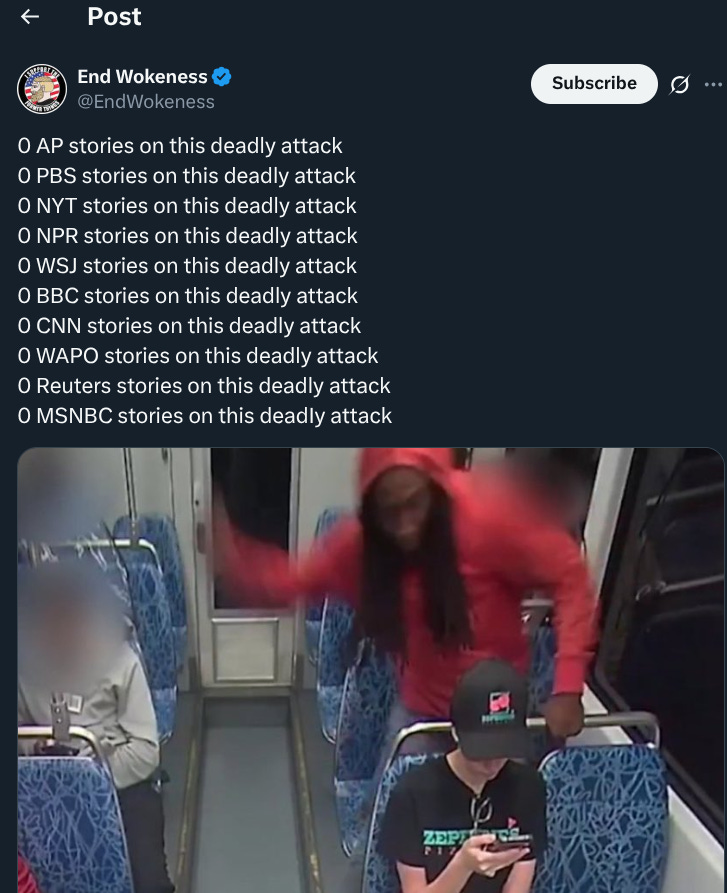 In 2018 an insane man stabbed two sisters on a BART (San Francisco/Bay Area) train platform, killing one of them. The sisters were Black, the murderer was white. There was understandable outrage, but also vigils, protests, debates, and swirling accusations of racism, etc. The story was major news for weeks afterwards. In 2025 an insane black man stabs a white woman to death on a train in Charlotte, NC and most of the media responds with near total silence.