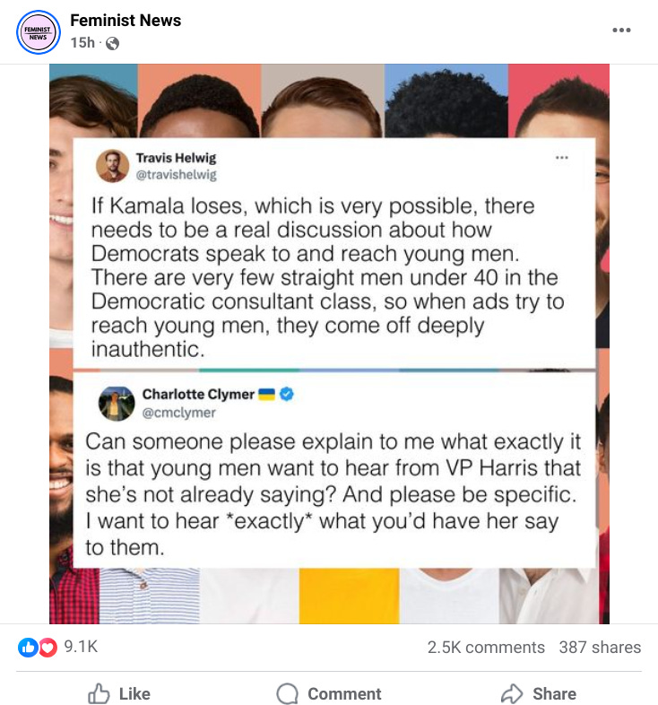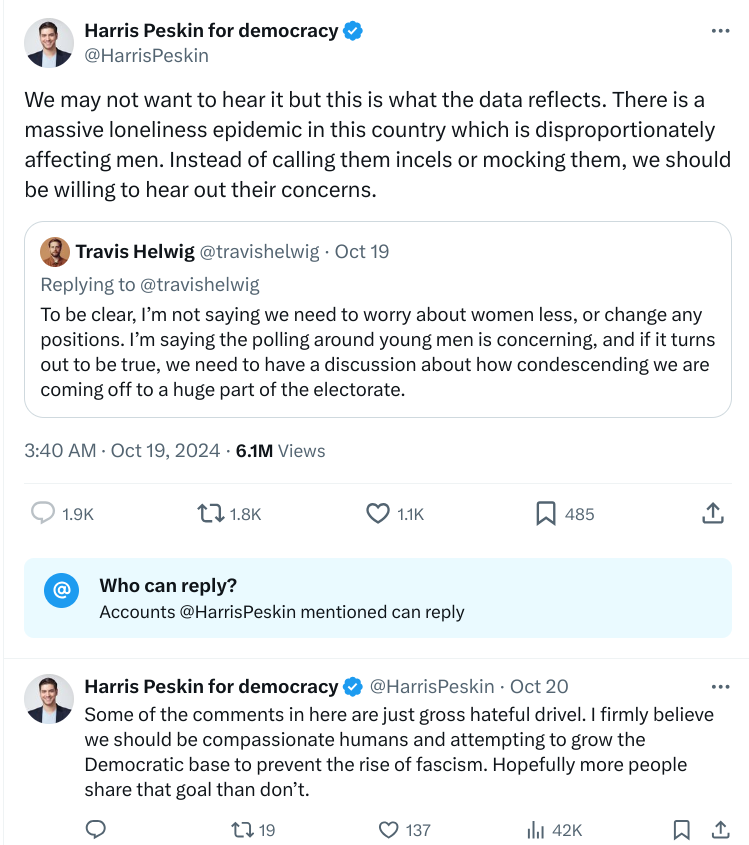 Look, this isn’t a post-mortem. Nobody’s candidacy is dead yet. There’s time for Kamala Harris and other Democrats to make some moves here. First, Harris should absolutely, 100% go on Joe Rogan’s podcast - which Trump is doing tomorrow - and do her damnedest to explain to the millions of men who tune in that she doesn’t think they’re a bunch of toxic assholes (by the way, she should do this even if she does think that). Floating in the bile, there were actually a handful of thoughtful comments on those posts above about what could represent effective types of male outreach. Somebody on the Harris campaign should probably read a few of them.