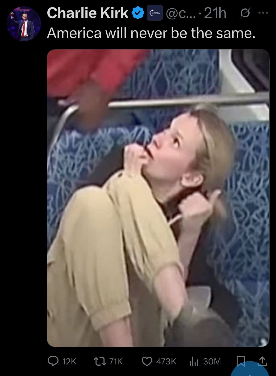 The very, very short version is that a young, Ukrainian woman was captured on video being stabbed in the neck from behind by a mentally ill black man as she rode a light rail train. It is her picture in that fateful Charlie Kirk post I showed above. One of the last pictures he ever shared. Or ever will share.