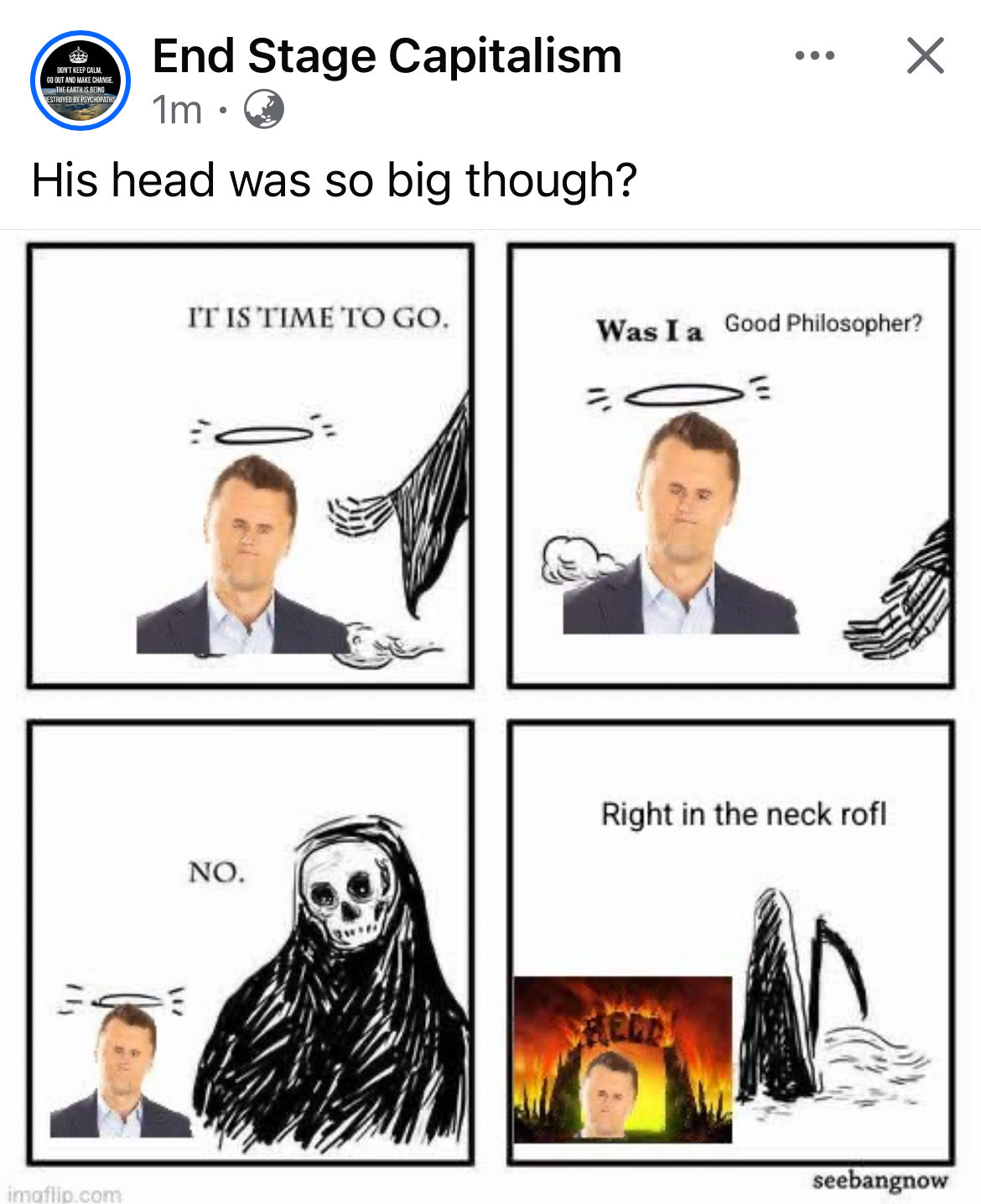 Charlie Kirk was murdered in front of his wife. In front of his two young children. They were there. In person. At the event. Watching their husband, their daddy, take one in the neck and keel over. I am hard pressed to imagine how a person could look more ghoulish than by regarding that as “just deserts.”