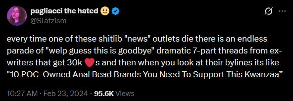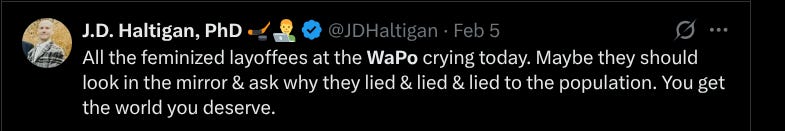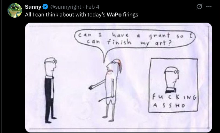 The Post announced a series of layoffs last week affecting roughly ⅓ of its staff; a devastating blow. They’re all but shuttering their international coverage, ditching sports, and massively down-scaling their arts and culture beats. One might think news like this would hit the country roughly and evenly, but one would be wrong. Outside of expressly left-leaning media spaces, WaPo’s faceplant has been met mostly by cheerful grave dancing.