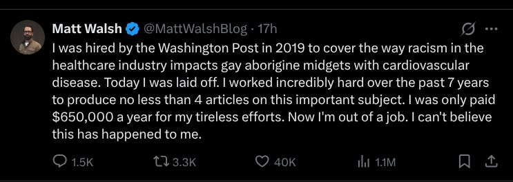 There’s nothing new, of course, about journalists leaning left, but the Post went especially hard in that direction. Over the last 10 years, their political and cultural correspondents have virtually all been regime songbirds. In a time of declining subscriber bases industry-wide, WaPo went out and hired a bunch of artless scribes to do nothing but woke stenography and brow-beating. What few conservative readers were still hanging on got dumped into the drink as the ship capsized to port and got trapped in a spiraling maelstrom of its own making.